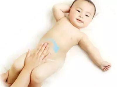 放平手掌,顺时针方向画圆抚摩宝宝的腹部。注意动作要特别轻柔,不能离肚脐太近。