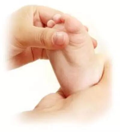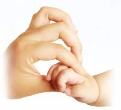 ①用手指划小圈按摩宝宝的手腕。用拇指抚摩宝宝的手掌,使他的小手张开。