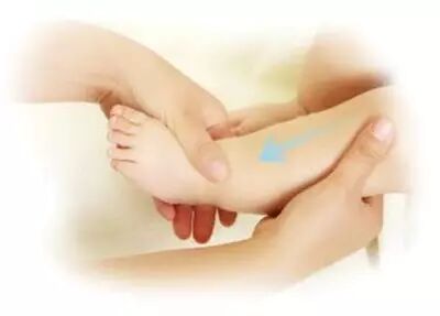 一只手托住宝宝的脚后跟,另一只手四指聚拢在宝宝的脚背,用大拇指指肚轻揉脚底,从脚尖抚摸到脚跟,反复3-4次。