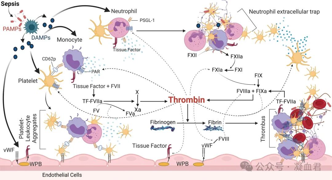 在脓毒症中,单核细胞被认为是内源性TF的主要来源, 已证实动物和人类脓毒症患者血浆中TF和含TF微粒水平升高 [4],并认为这是血管内凝血酶生成的驱动因素,证实单核细胞在内毒血症反应中生成血浆TF的首要作用。随后,凝血酶可通过蛋白酶激活受体 (PAR) 与单核细胞相互作用,进一步增强TF的表达,形成白细胞活化、TF表达和凝血酶生成的正反馈回路。通过激活的循环单核细胞增加促凝组织因子(TF)表达、促进凝血酶生成的中性粒细胞胞外陷阱 (NETs) 形成、伴有内皮损伤的明显血管炎症以及受损的抗凝机制是SIC 病理生理学基础(如下图)。脓毒症期间微生物释放PAMP,或受损宿主细胞释放DAMP,这两者都会导致免疫细胞活化和单核细胞、内皮细胞和中性粒细胞的TF表达,随后产生凝血酶,凝血酶是自身增殖的强大正反馈信号从而导致大量凝血酶产生。此外,活化的NETs可作为多聚阴离子表面,进一步生成凝血酶。血小板脱颗粒、白细胞TF表达、NET形成和PLA形成促进(虚线)凝血酶生成,导致纤维蛋白生成和血小板消耗,从而导致微血管血栓形成[1]。