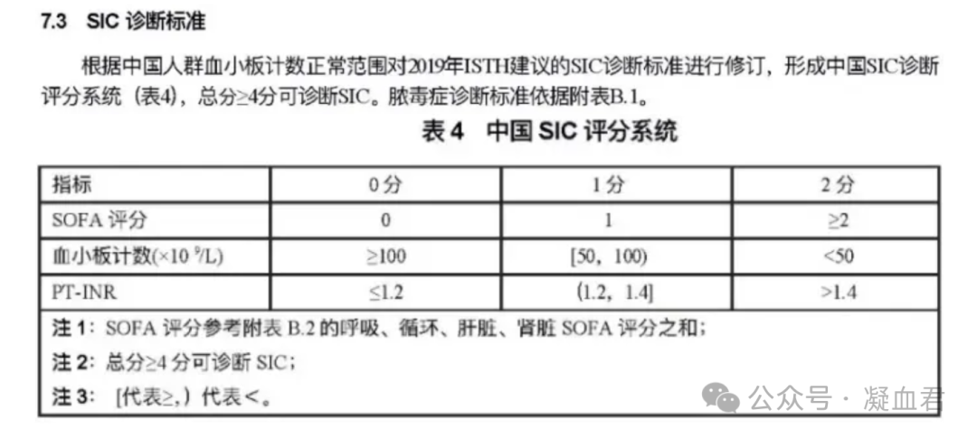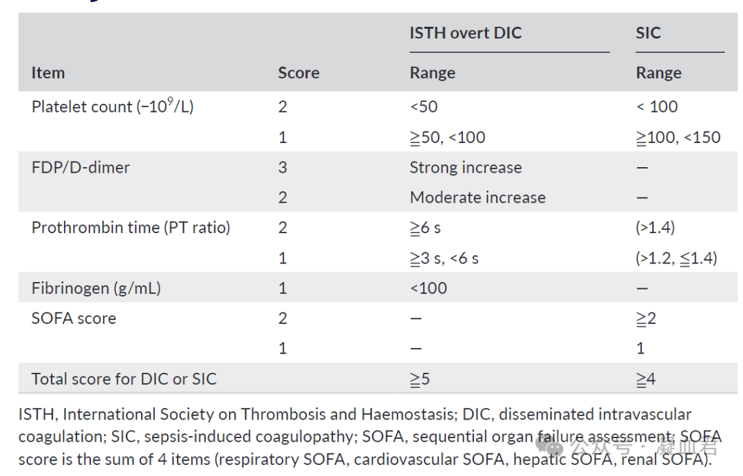 生理性止血是促凝和抗凝途径之间的一种平衡,在脓毒血症中,这种平衡会被破坏,期间凝血酶大量生成,抗凝活性明显受损,纤维蛋白溶解受到抑制,这种情况称为脓毒血症诱导的凝血病(SIC)[1]。SIC是一种常见的并发症,在24%的脓毒症患者和66%的脓毒症休克患者中存在,并且通常与临床预后差和高死亡率相关[2]。SIC由先天免疫系统和凝血系统之间的病理相互作用引发。其特点是全身炎症和凝血激活,导致微血管血栓、器官灌注受损以及随后的器官功能障碍。SIC与DIC存在差别,在DIC 中,存在总体消耗性血管内凝血病,这意味着血小板、纤维蛋白原和凝血因子显著减少,并有血栓和/或出血倾向的临床证据。相比之下,SIC是一种非显性 DIC,也表现为全身性血管内凝血,但没有血小板、纤维蛋白原和凝血因子的总体消耗,并且通常先于 DIC 失代偿性凝血病发生。下图为ISTH overt DIC and SIC评分系统[3]。近期中国医药教育协会血栓与止血危重病专委会在南昌发布的《凝血障碍诊断规范》团体标准如下图,其中血小板计数相比ISTH对SIC的诊断标准有所变更,更改为与DIC诊断标准一致。
