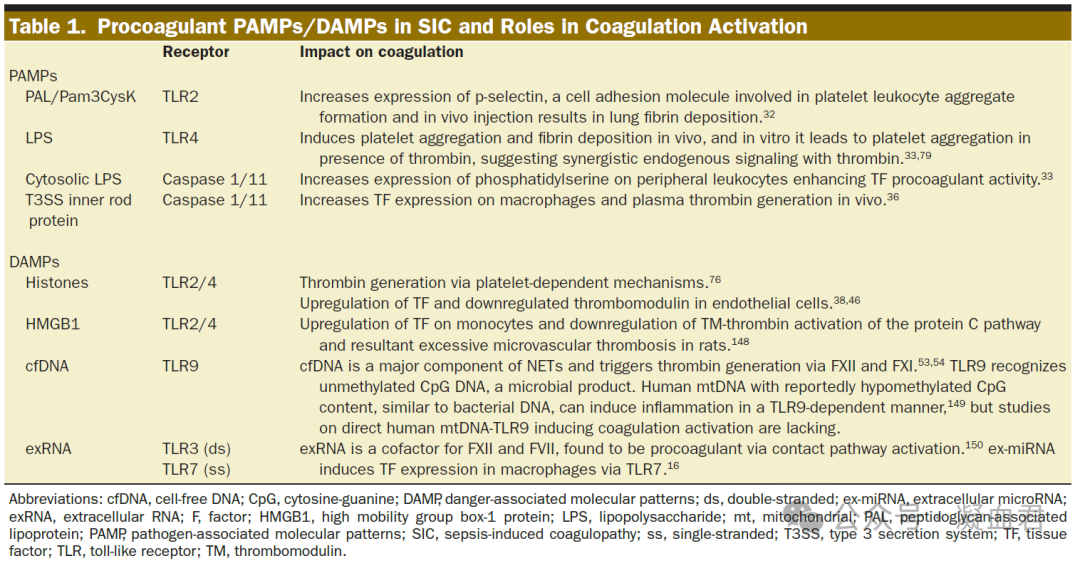 病原体相关分子模式(pathogen associated Molecular Patterns, PAMPs)在SIC中起关键作用。PAMPs是病原体的糖蛋白、膜组分和核酸的分子片段。这些分子的模式被宿主受体识别,包括toll样受体(TLRs) ,并触发先天免疫系统的细胞和非细胞成分的激活,细菌细胞膜成分是公认的PAMPs,其中一些与促凝活性直接相关。危险相关分子模式 (DAMP) 是宿主细胞在应激条件下释放的内源性生物分子,可触发先天免疫反应。DAMP被公认为脓毒症中免疫失调和促凝信号的介质。它们包括核结合蛋白以及核酸,可通过TLR依赖性或非依赖性途径发出信号。